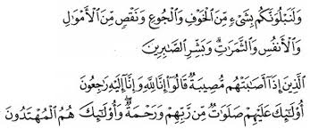 "Dan sesungguhnya akan Kami berikan cubaan kepadamu, dengan sedikit ketakutan, kelaparan, kekurangan harta, jiwa dan buah-buahan. Dan berikanlah berita gembira kepada orang-orang yang sabar. (Yaitu) orang-orang yang apabila ditimpa musibah, mereka mengucapkan: 'Sesungguhnya kami adalah milik Allah dan kepada-Nya-lah kami kembali.' Mereka itulah yang mendapat keberkatan yang sempurna dan rahmat dari Tuhan mereka, dan mereka itulah orang-orang yang mendapat petunjuk." (Al-Baqarah 2:155-157)
